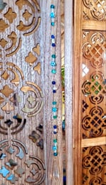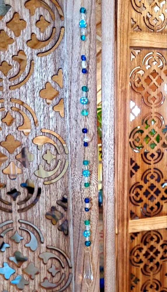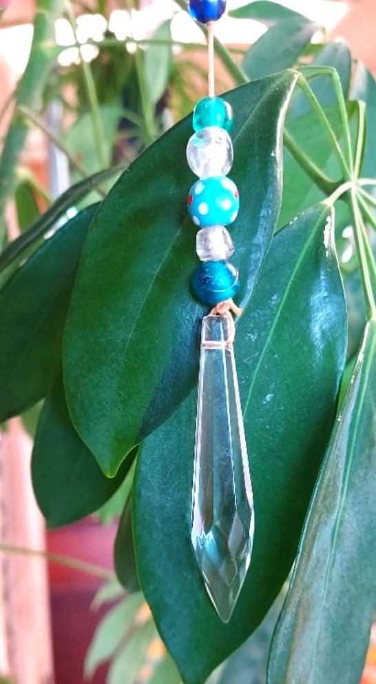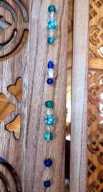 This beautiful suncatcher is made from glass beads and a crystal prism. A variety of blues makes for a beautiful hanging for your home or office space. When hung in direct sunlight it will cast rainbows making for a relaxing ambiance.